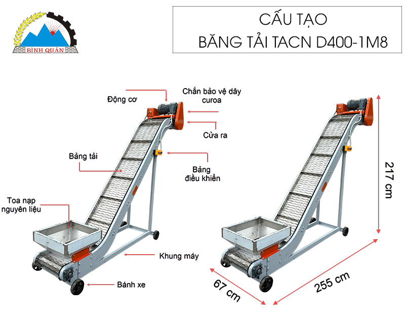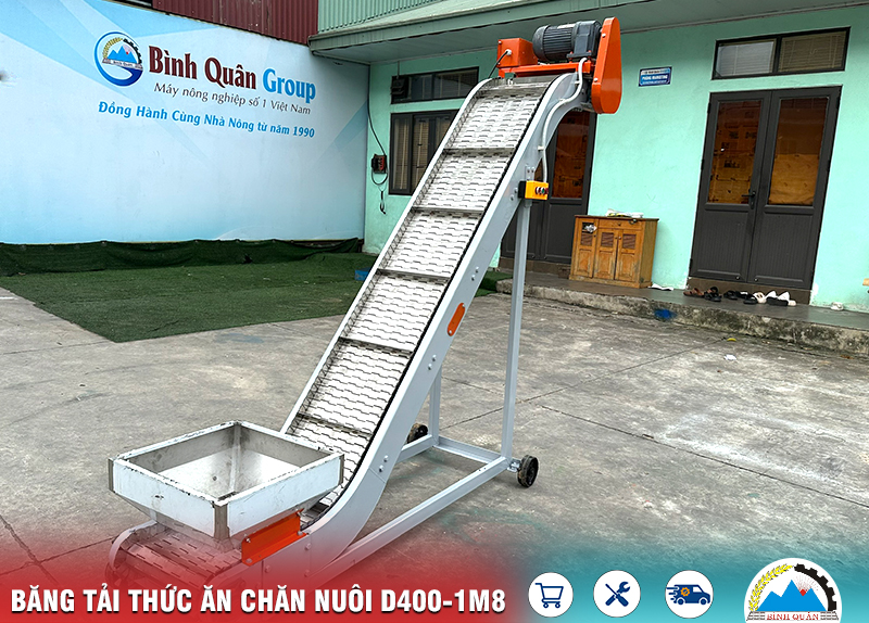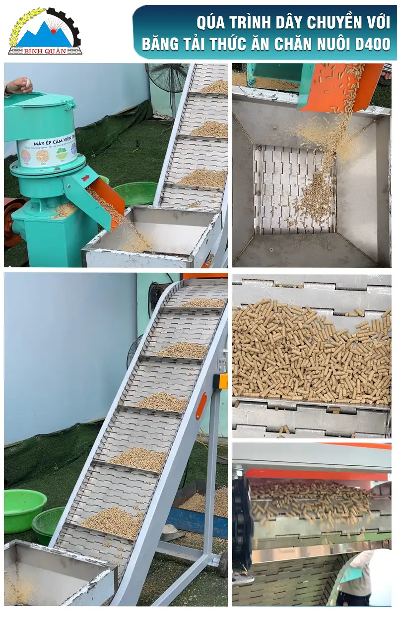 Băng tải thức ăn chăn nuôi D400 do công ty Bình Quân sản xuất, thiết bị mang đến giải pháp tự động hóa khâu trung chuyển nguyên liệu, từ vị trí thấp lên vị trí cao một cách dễ dàng