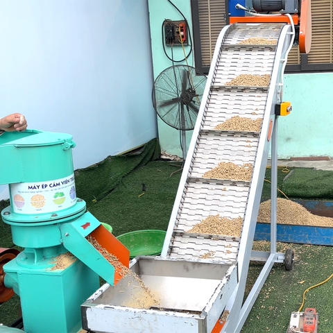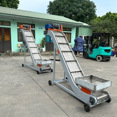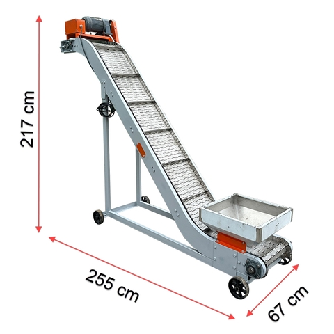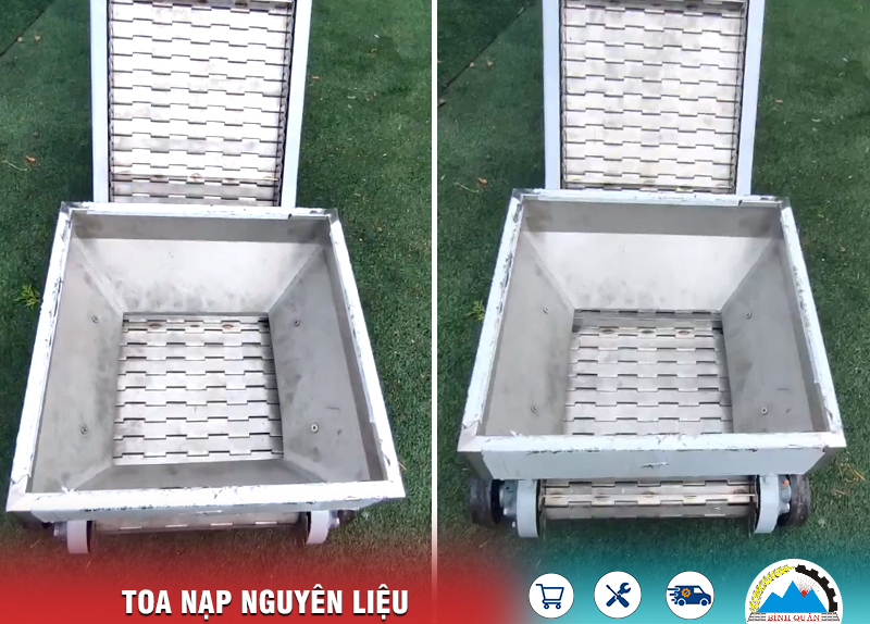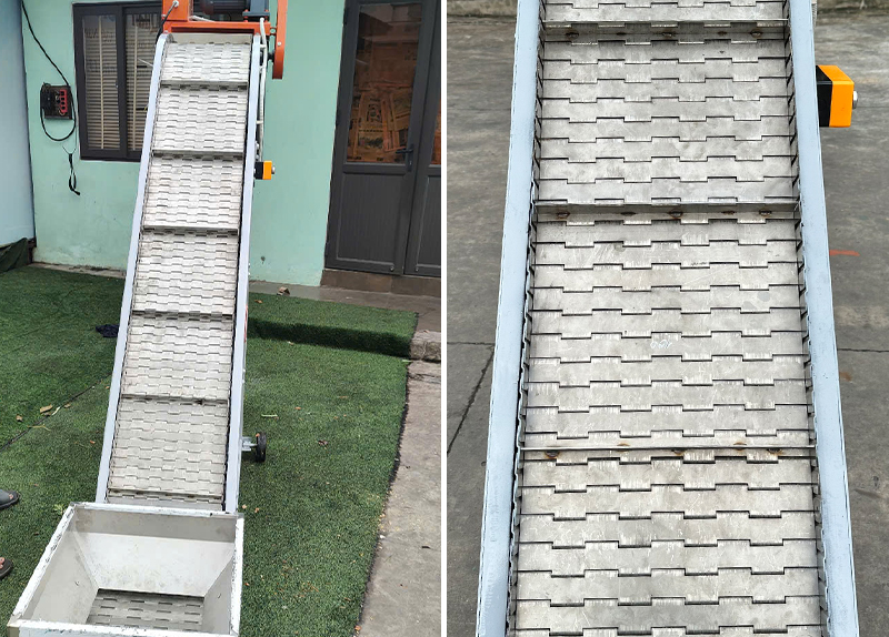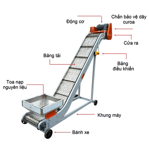 - Trên bề mặt băng tải kết hợp với các thanh ngang tạo thành các khoang chứa nhất định, giúp nguyên liệu không rơi ra ngoài