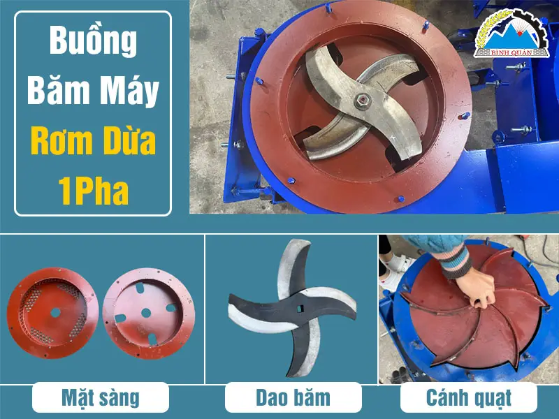 Buồng băm được trang bị 2 con dao thép 2 lưỡi kết hợp với 2 cánh đảo và quạt giúp máy có thể băm được nhiều nguyên liệu khó nhằn như: vỏ dừa tươi-khô, rơm, bã mía, lõi ngô...