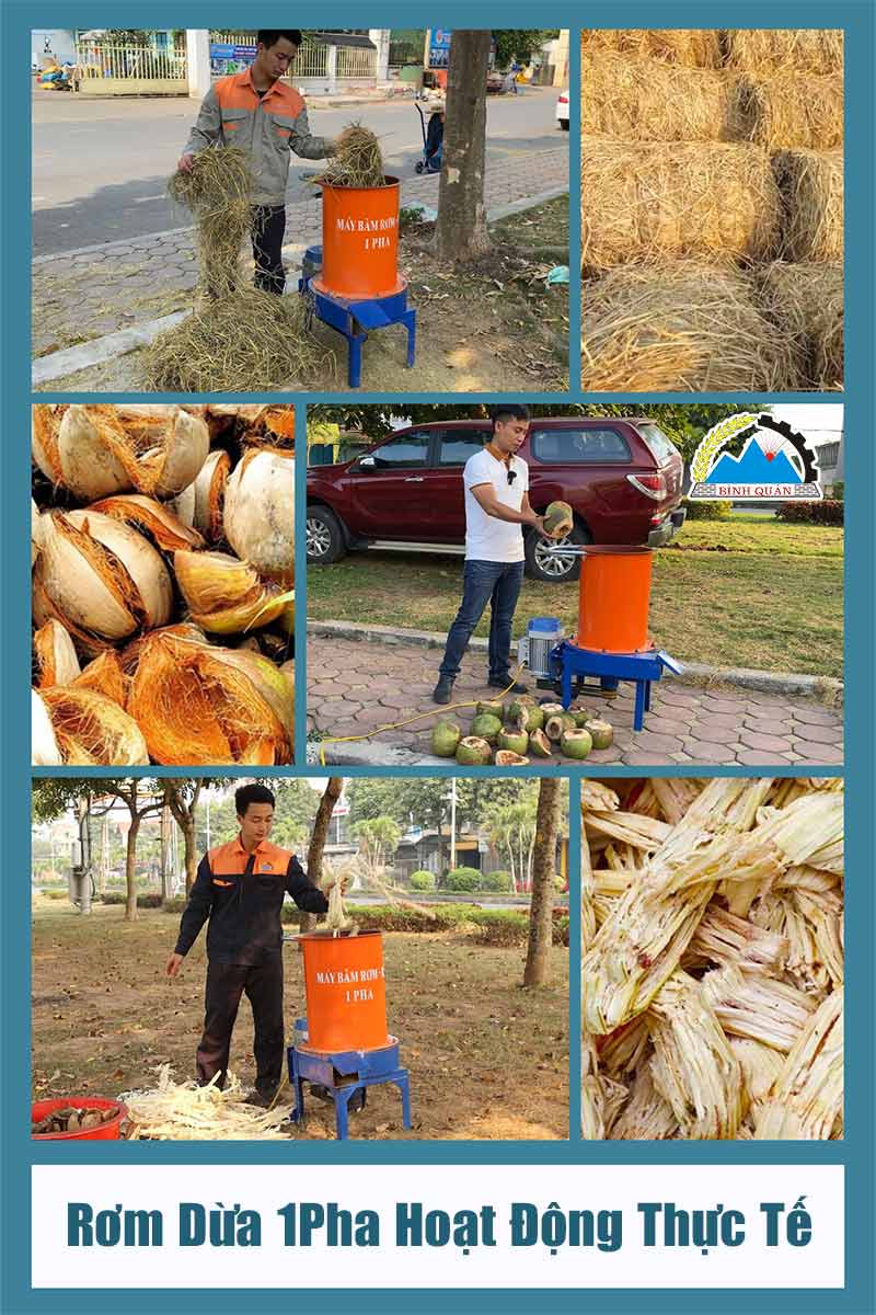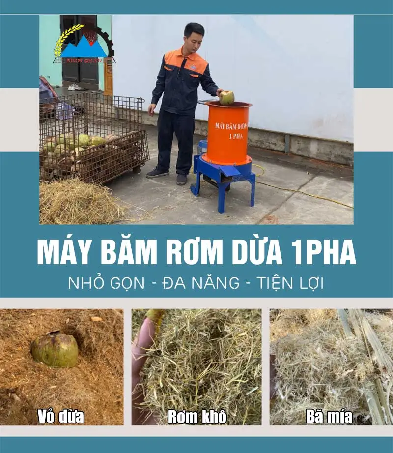 Rơm dừa 1pha có kích thước nhỏ gọn, dễ vận hành vào bảo trì. Khi máy lắp động cơ 3,5kW - 220V, cho năng suất đạt 150-300kg/giờ (tùy nguyên liệu).