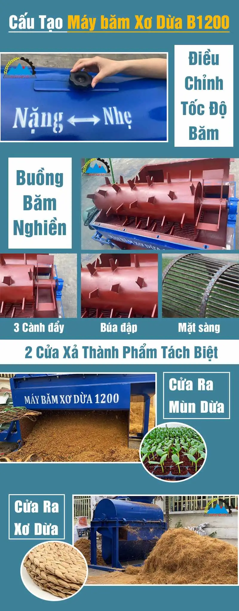 B1200 là dòng máy băm xơ dừa công nghiệp có năng suất vượt trội, có thể băm đến 1 tấn vỏ dừa mỗi giờ.