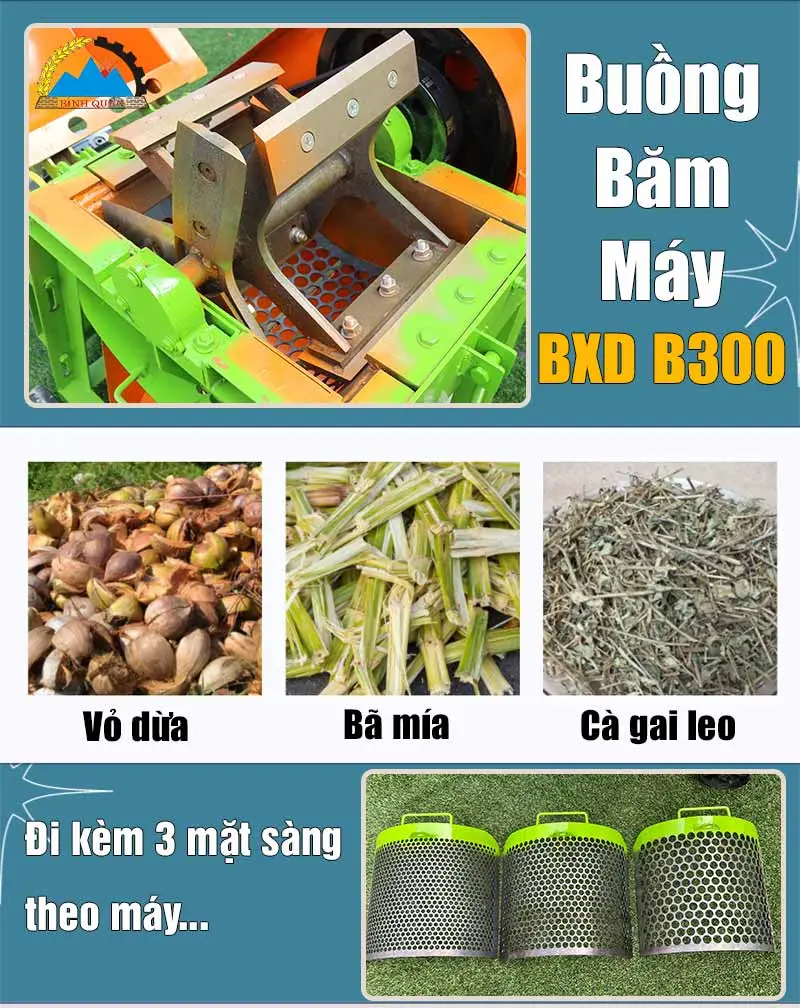 Điểm nổi bật của B300 là đi kèm theo máy sẽ có 3 mặt sàng có kích thước từ nhỏ đến lớn. Vì vậy mà bà con có thể tùy ý lựa chọn kích thước thành phẩm như ý muốn.