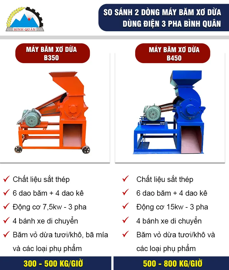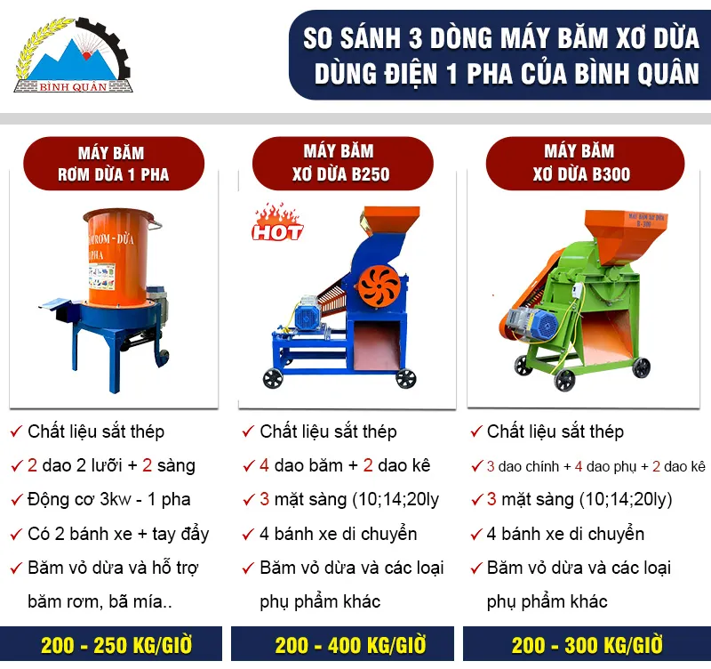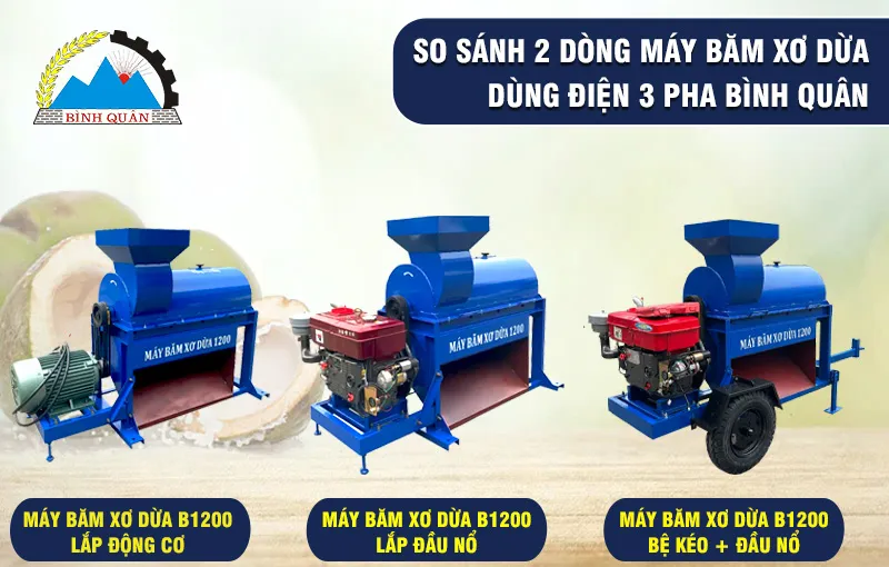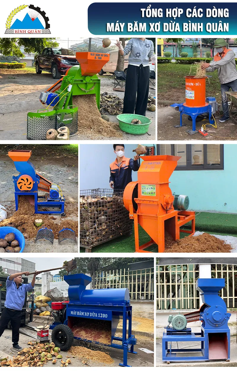 Hiện công ty Bình Quân sản xuất 3 phân khúc; máy băm xơ dừa 1 pha; máy băm xơ dừa 3 pha và máy băm xơ dừa công nghiệp