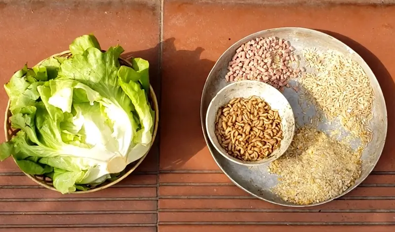 - Tỷ lệ: 70% thóc (nên dùng thóc lúa mạch hoặc thóc đãi sạch phơi khô) + 20% rau xanh + 10% cám