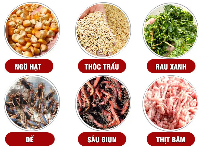 - Thức ăn chính: gồm ngũ cốc, thóc, cám. Thóc nên được đãi sạch và phơi khô để đảm bảo vệ sinh