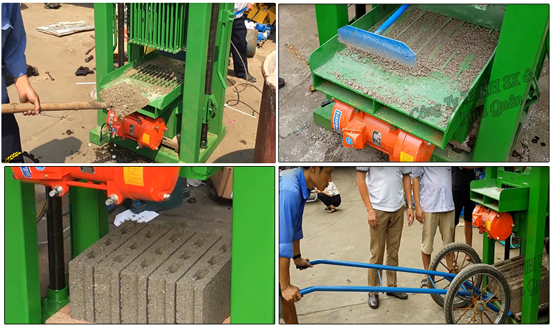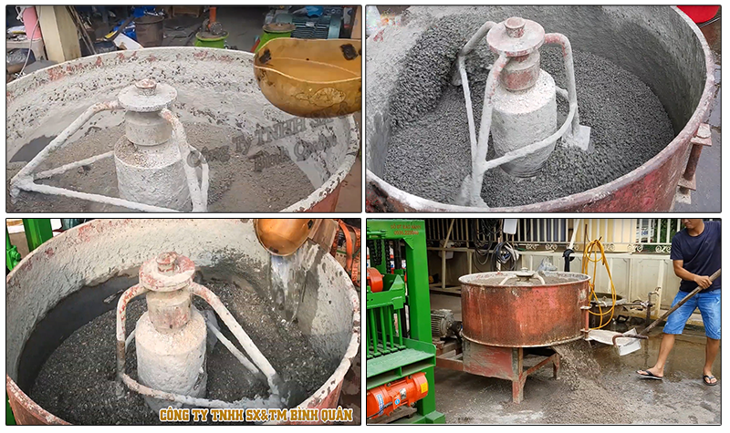 - Cùng với việc phối trộn nguyên liệu, thiết bị trực tiếp sản xuất ra gạch viên, hoạt động theo cơ chế ép kết hợp với 3 bộ đầm rung tạo ra lực ép máy nén gạch ra viên.