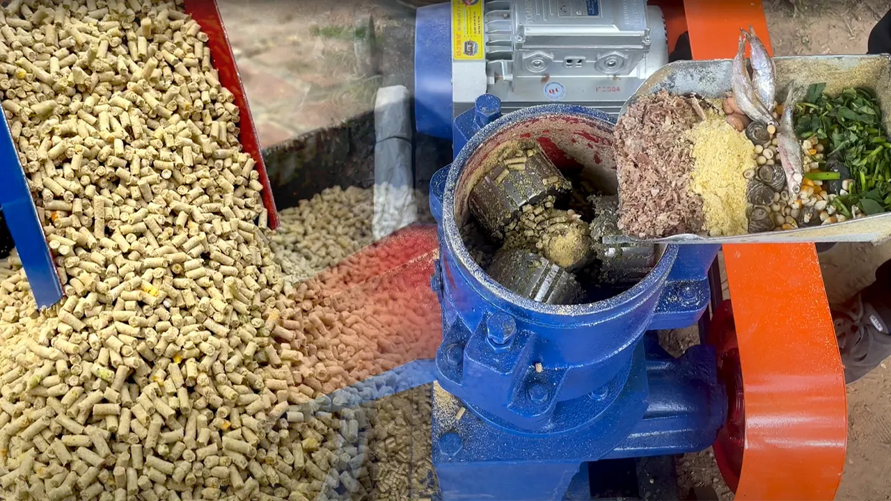 Kết hợp thóc cám với đồ tươi như sâu, dế, thịt và bổ sung rau xanh cho hỗn hợp vào máy ép cám tạo thành viên dùng dần để lông luôn bóng mượt