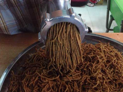 cho thêm rau củ quả băm nhỏ rồi ép thành cám rạng sợi, khi phơi khô hoặc sấy khô rồi xoa cám sẽ gãy vụn ra thành viên cám như các loại cám mua.