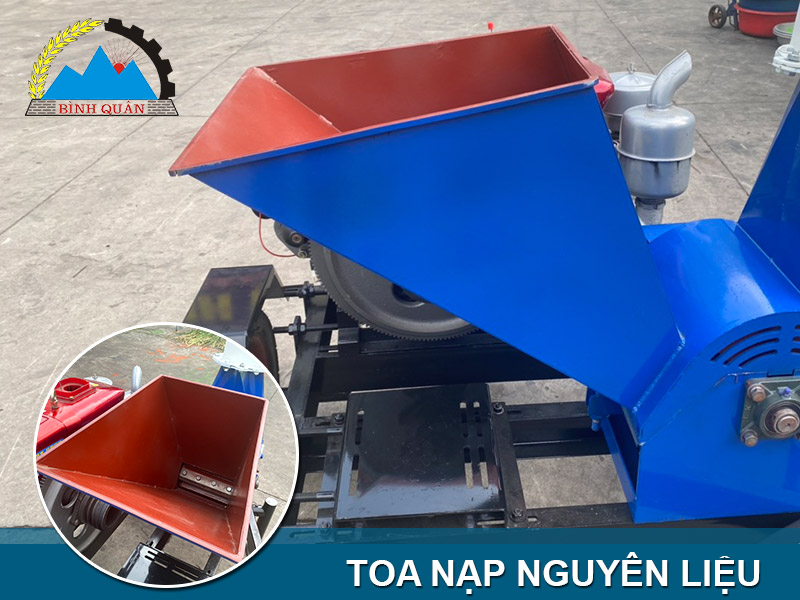 Toa nạp của máy được thiết kế dạng phễu lớn, phần trọng tâm khung máy hạ thấp tối đa thuận tiện khi cấp liệu giúp giảm độ rung và tránh được nguyên liệu băn ra ngoài trong quá trình băm