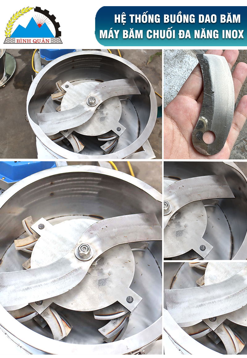 Buồng băm của máy được bố trí gồm 1 dao thép to 2 lưỡi và 14 dao inox nhỏ được xếp 2 tầng băm linh hoạt băm nhỏ nguyên liệu