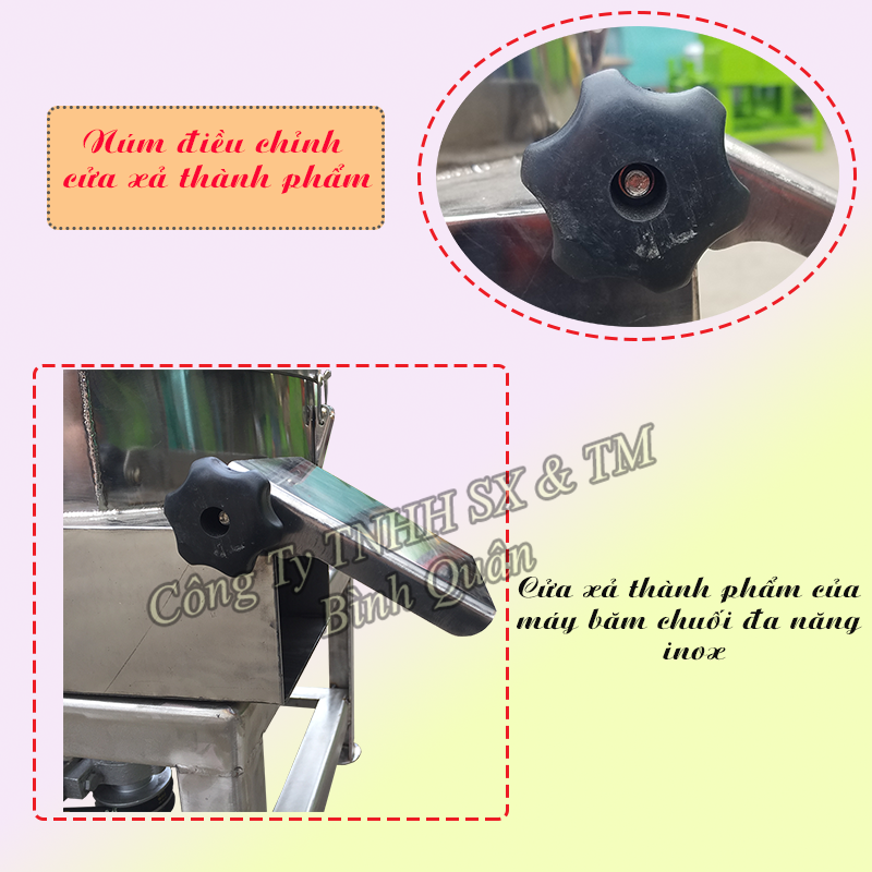 Điều đặc biệt khác với dòng máy băm chuối trước đây, máy băm chuối inox được thiết kế cửa xả thành phẩm đã có nắp đậy và núm điều chỉnh độ văng xa hay gần của thành phẩm tùy theo nhu cầu sử dụng của bà con.
