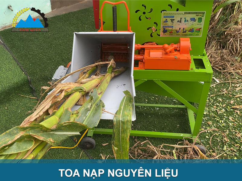 Nguyên liệu được đưa trực tiếp vào toa nạp, hệ thống quả lô sẽ hút và dập nguyên liệu cỏ đưa vào máy sau đó bộ dao sắc bén sẽ băm nhỏ nguyên liệu.