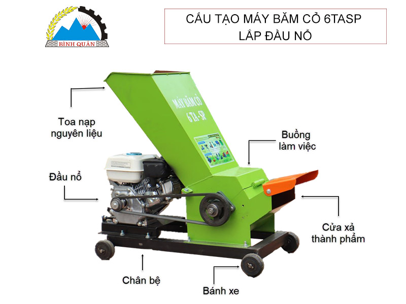 Máy băm cỏ 6TASP lắp đầu nổ phiên bản mới do công ty Bình Quân trực tiếp sản xuất chuyên dùng băm nhỏ các loại phụ phẩm nông nghiệp làm thức ăn chăn nuôi cho gia súc, gia cầm