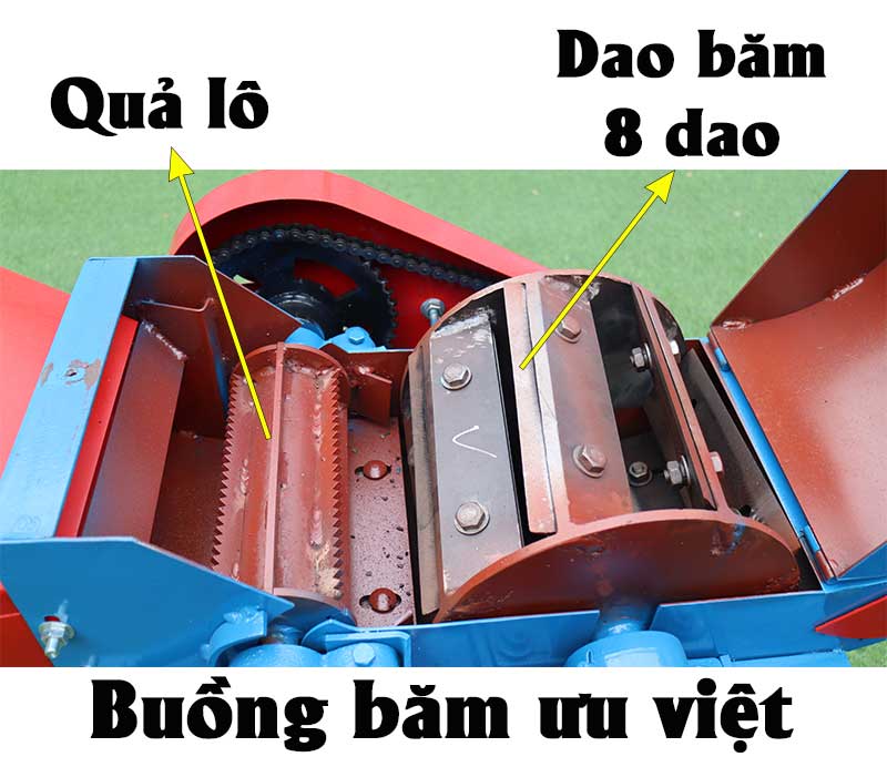 Bố trí 8 dao 2 lưỡi trên 1 trục quay , dao băm được làm bằng thép CT45 dày dặn và sắc bén các lưỡi dao xếp chéo cắt xéo, gia tăng khả năng băm những thân cây cỏ già cứng hoặc băm rơm nhanh chóng