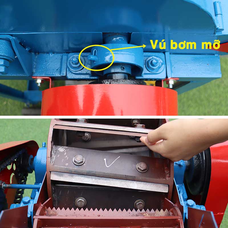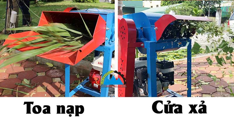 Toa nạp dạng máng ngang vừa tầm người dùng đưa cỏ vào dễ dàng, phía bên trong cổ nạp hỗ trợ kẹp kéo cỏ với 2 quả lô, đảm bảo an toàn cho người dùng mà không cần đưa tay vào quá sâu.