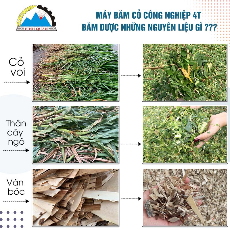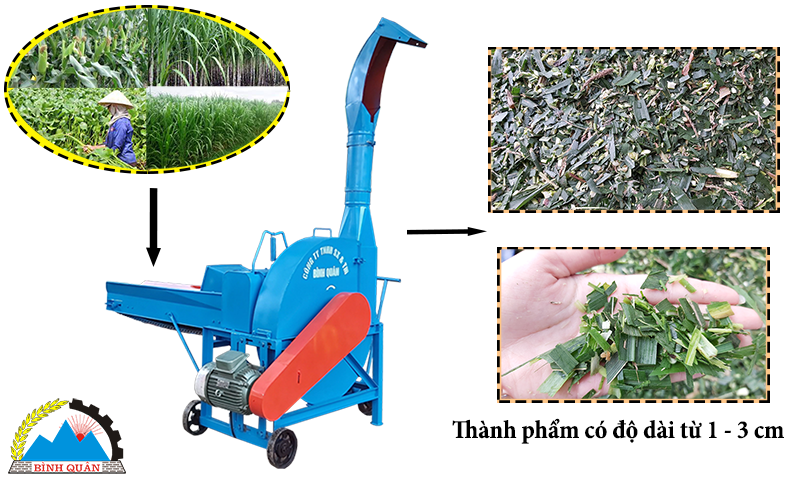 - Làm thức ăn chăn nuôi: máy băm cỏ voi, thân cây ngô, cây mía, khoai sắn..