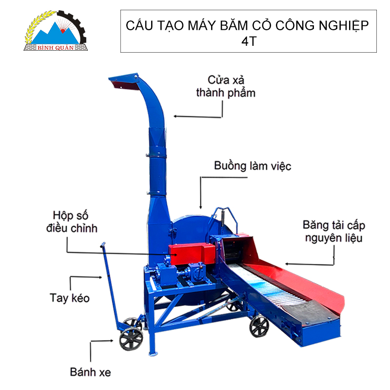 Công Ty TNHH Sản xuất và Thương mại Bình Quân xin giới thiệu tới bà con chăn nuôi dòng máy băm cỏ công nghiệp 4T, giúp người lao động băm nhanh nhỏ các loại cỏ voi, thân cây ngô, …với số lượng cực lớn, làm việc liên tục.