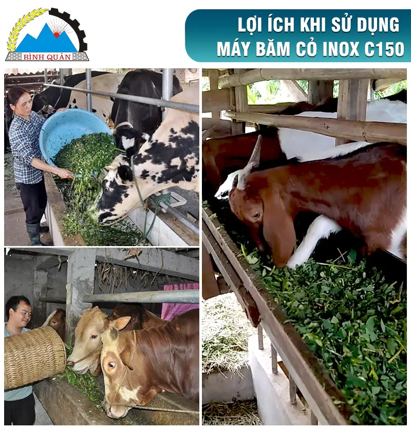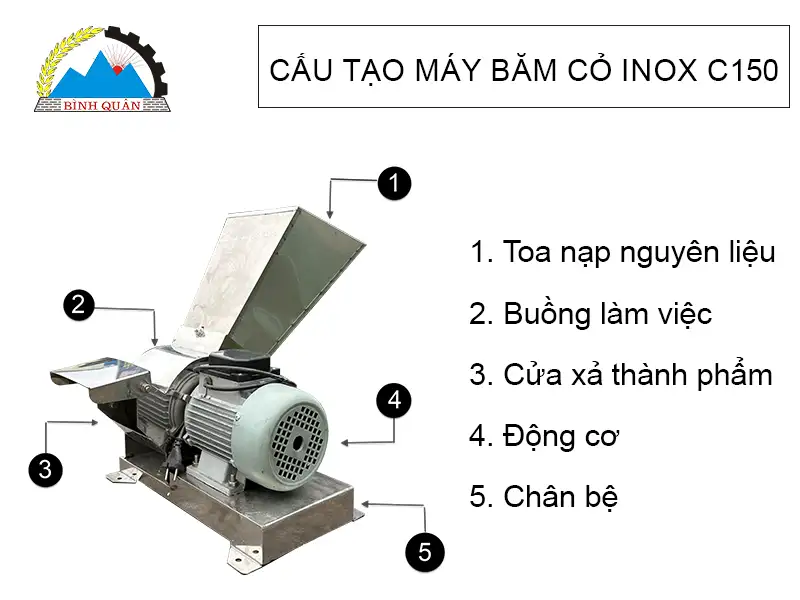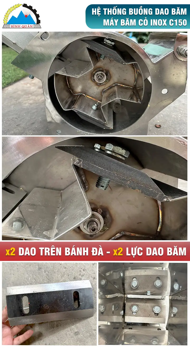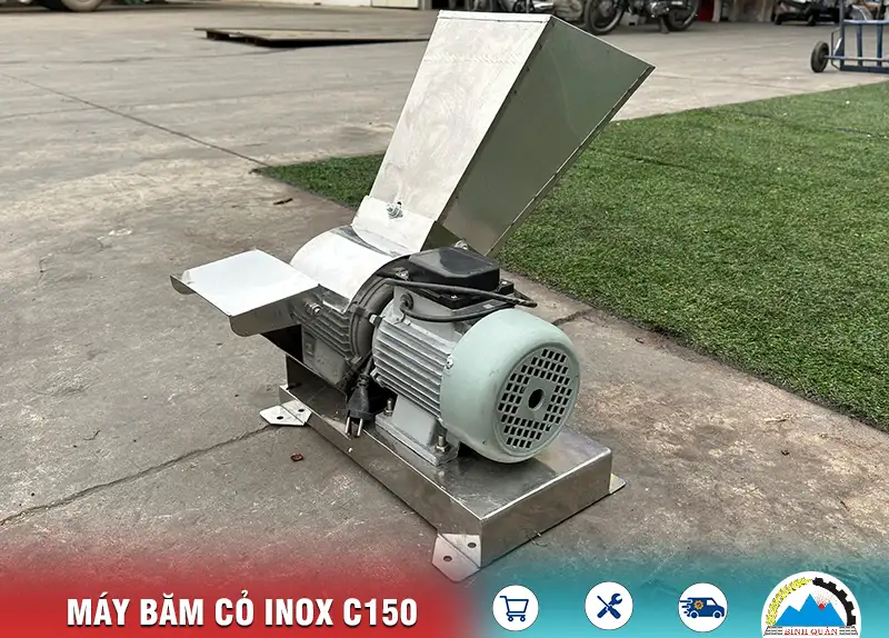 Máy băm cỏ inox C150 do công ty Bình Quân sản xuất chuyên dùng băm nhỏ các loại phụ phẩm nông nghiệp làm thức ăn chăn nuôi cho gia súc - gia cầm