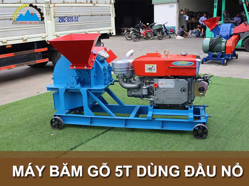 Máy băm gỗ 5T dùng đầu nổ do công ty Bình Quân sản xuất là thiết bị được sử dụng để băm cây gỗ, cành cây, ván bóc,... tạo thành mảnh nhỏ làm dăm gỗ.