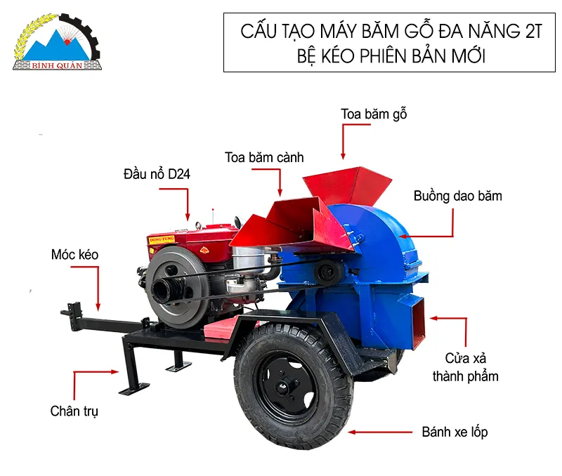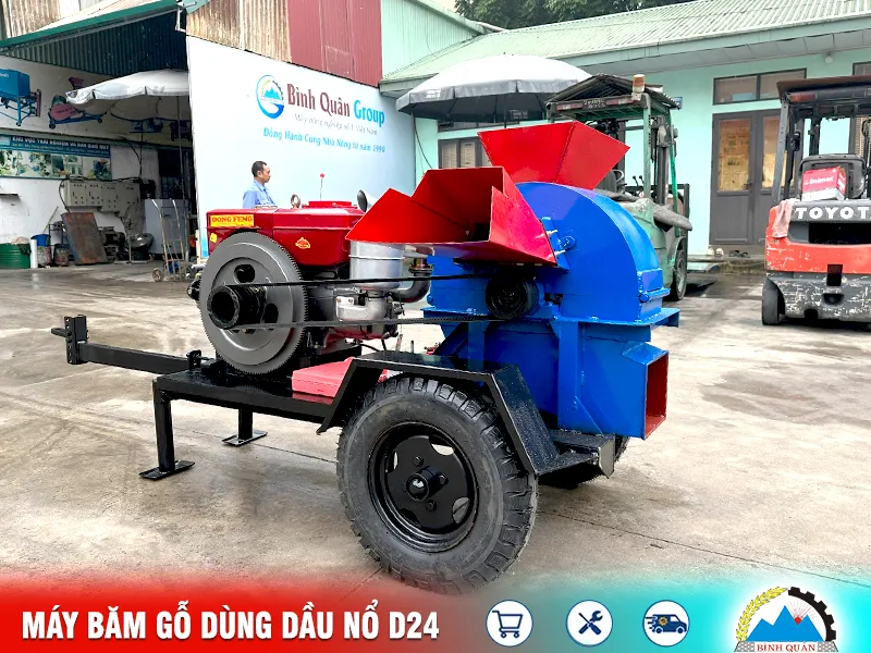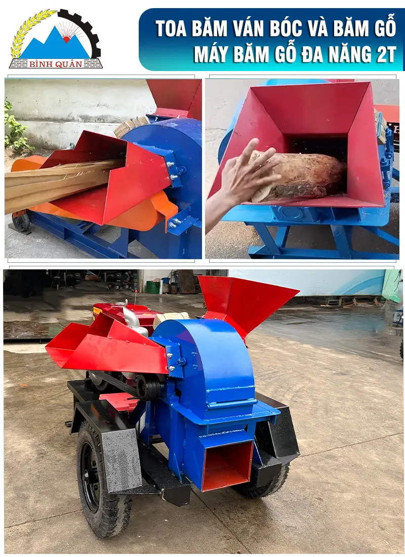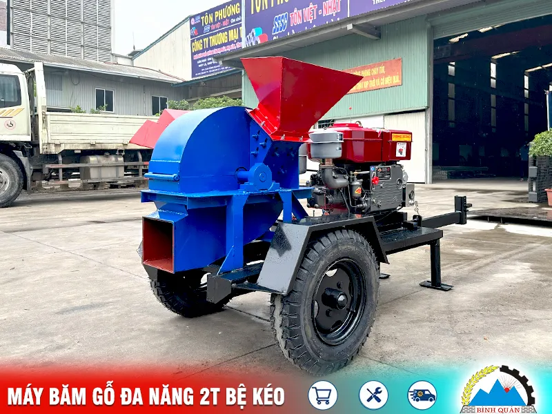 Máy băm gỗ đa năng 2T bệ kéo lắp đầu nổ do công ty Bình Quân sản xuất - mang đến giải pháp thông minh cho bà con tận dụng tối đa nguồn nguyên liệu dưa thừa, gia tăng thu nhập: