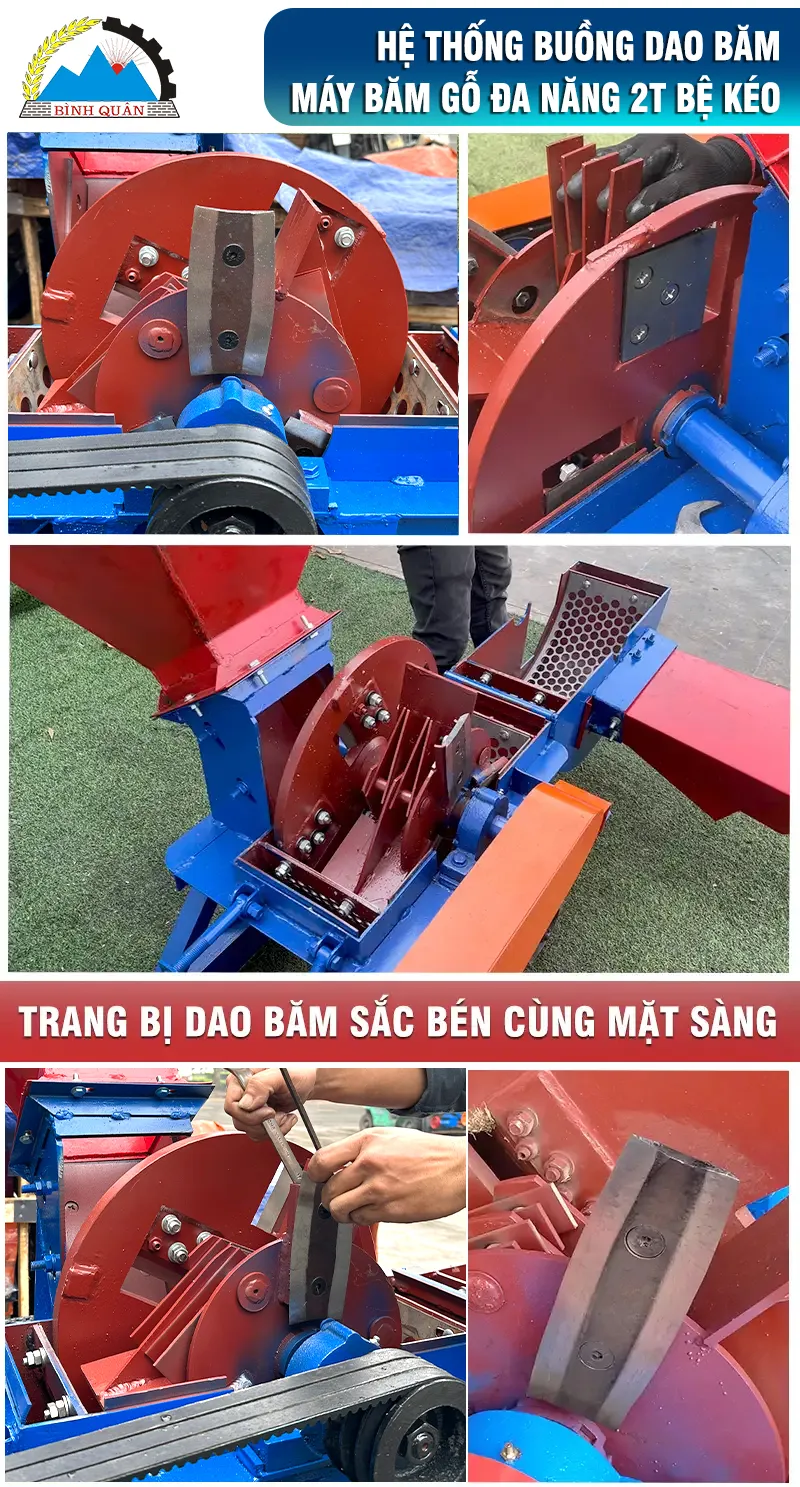 Máy được trang bị 3 lưỡi dao băm cành to bản sắc bén, kết hợp với 12 búa nghiền và bánh đà chắc khoẻ. Trên bánh đà có gắn thêm 4 dao băm gỗ và mặt sàng lỗ