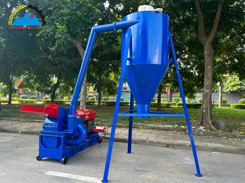 Thành phẩm sau khi nghiền sẽ được cánh quạt thổi đưa qua bầu hút gió. Bầu gió hút thành phẩm đã nghiền đưa xuống cửa xả nhanh chóng