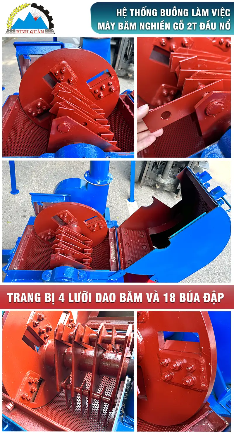 Hệ thống buồng làm việc của máy gồm 4 lưỡi dao băm gỗ sắc bén lắp cố định trên 1 đĩa quay và 18 búa đập dày được lắp đặt tạo độ văng đập trên 1 trục chính cửa máy
