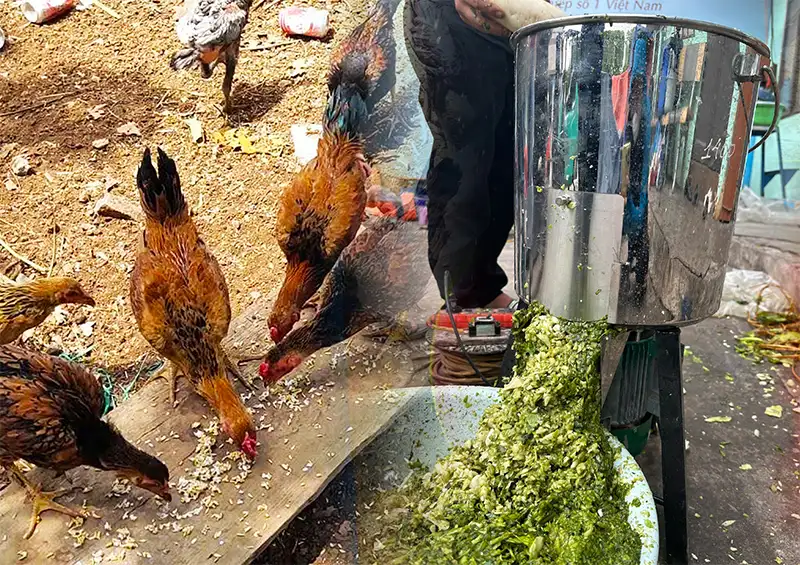 Thành phẩm sau khi băm được đưa ra ngoài cửa xả - rau băm đều vật nuôi dễ ăn - ăn được nhiều hơn so với băm thủ công