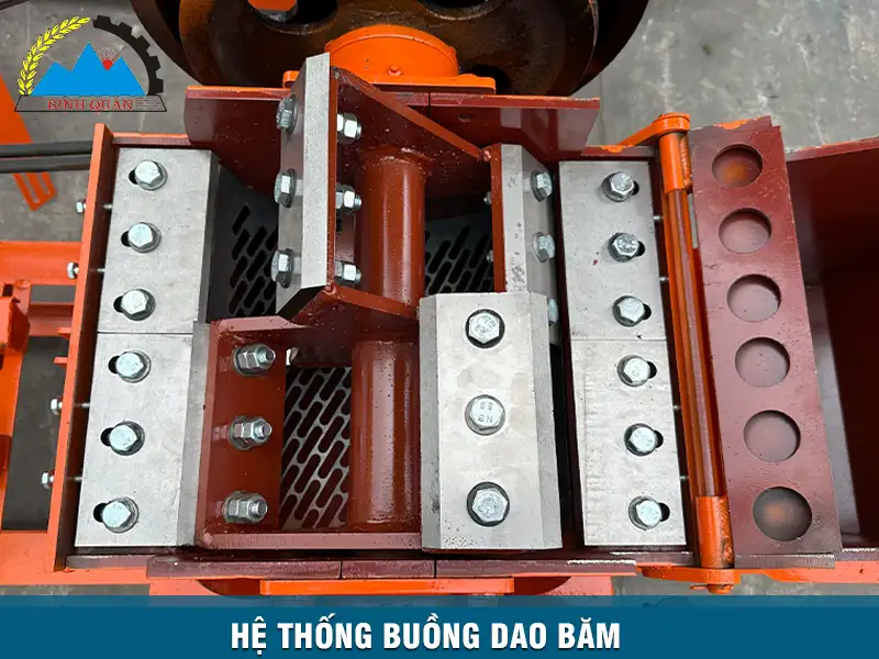- 6 dao băm chính gắn trên trục quay hoạt động băm nghiền nhỏ nguyên liệu đến khi vừa với lỗ sàng lắp bên dưới và thoát ra ngoài