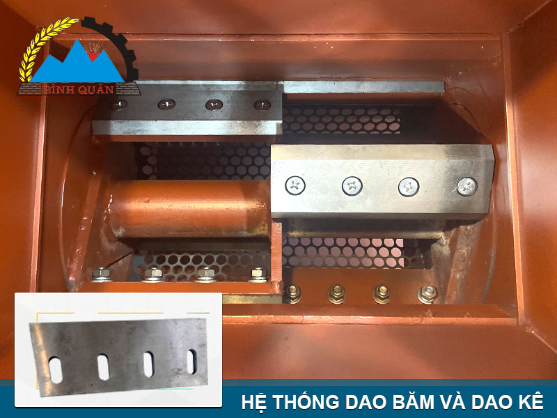Hệ thống dao băm được trang bị 6 lưỡi dao dày dặn được rèn sắc bén gắn trên trục quay chính, kết hợp lưỡi dao gắn cố định 2 bên thành. Có nhiệm vụ băm - xay nhỏ nguyên liệu trong thời gian ngắn.