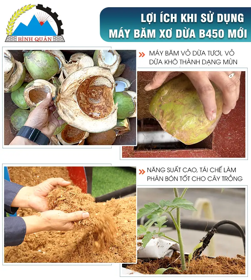Hãy để công ty Bình Quân mang tới cho bạn giải pháp xử lý hiệu quả với máy băm xơ dừa B450 phiên bản mới