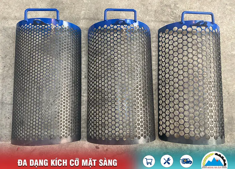 Người dùng có thể lựa chọn lắp kích cỡ mặt sàng lỗ ( ví dụ: 10ly; 14ly và 20 ly) để lắp trong máy cho thành phẩm có kích vỡ như mong muốn