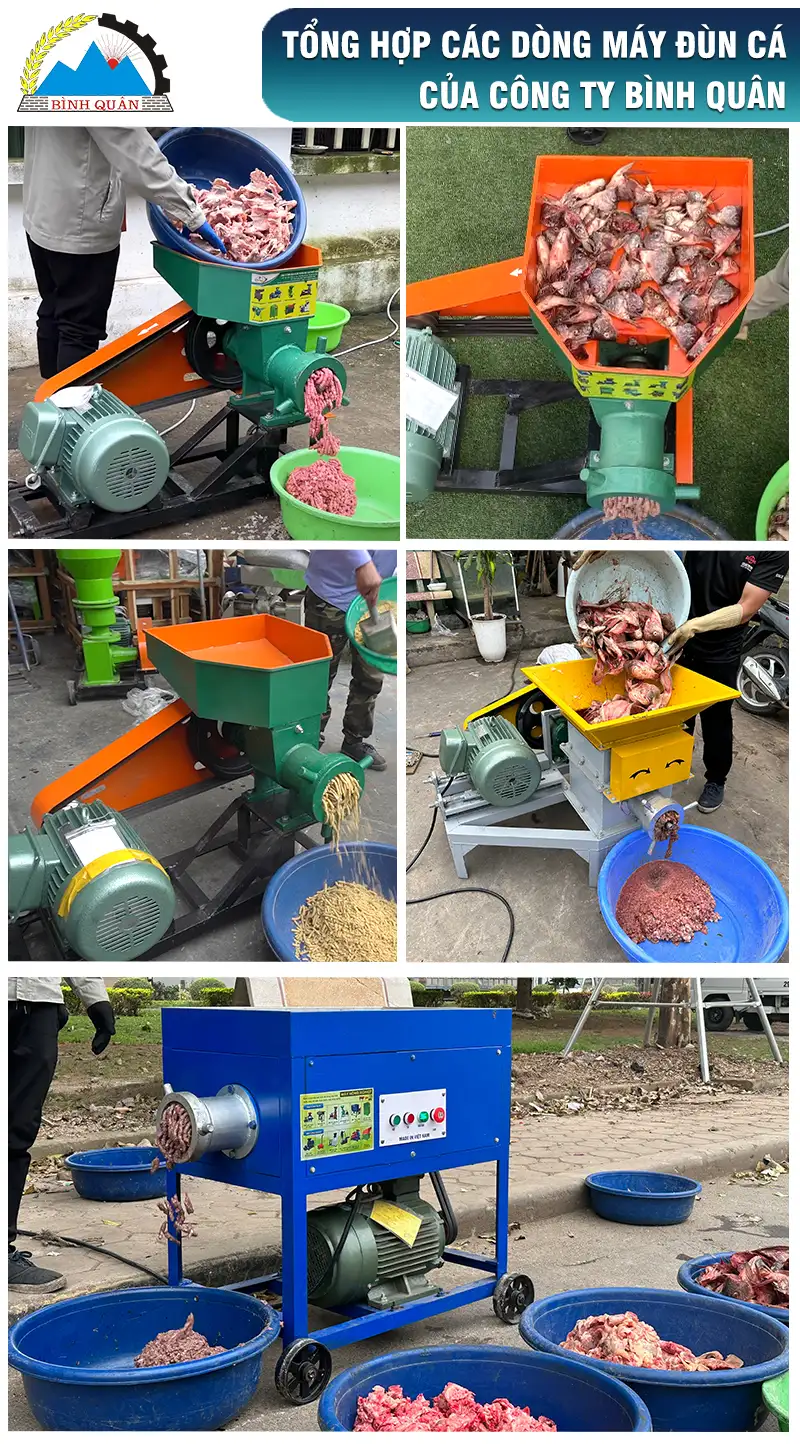 Máy đùn cá công nghiệp do công ty Bình Quân sản xuất thiết bị chuyên dùng để xay - nghiền nhuyễn các nguyên liệu tươi sống như cua, cá, ốc, đến các loại phế phầm như xương gà, xương lợn.. làm thức ăn cho gia súc, gia cầm
