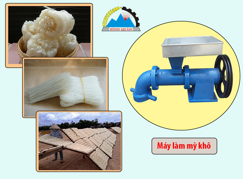 Máy đùn mỳ khô, bún khô Bình Quân chuyên dụng làm ra thực phẩm mỳ khô, bún khô đảm bảo vệ sinh an toàn thực phẩm. Đảm bảo thành phẩm được làm ra thơm, ngon người dùng phải sử dụng gạo đã được ngâm từ 7 - 10 tiếng rồi nghiền thành bột mịn ( thành phẩm sợi dai, sóng sợi).