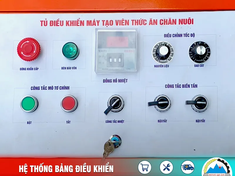Hệ thống tủ điện sẽ vận hành toàn bộ hoạt động của máy, bao gồm bộ phận bón nguyên liệu, trục xoắn đùn ép, bộ phận tạo nhiệt và bộ phận dao cắt cám.