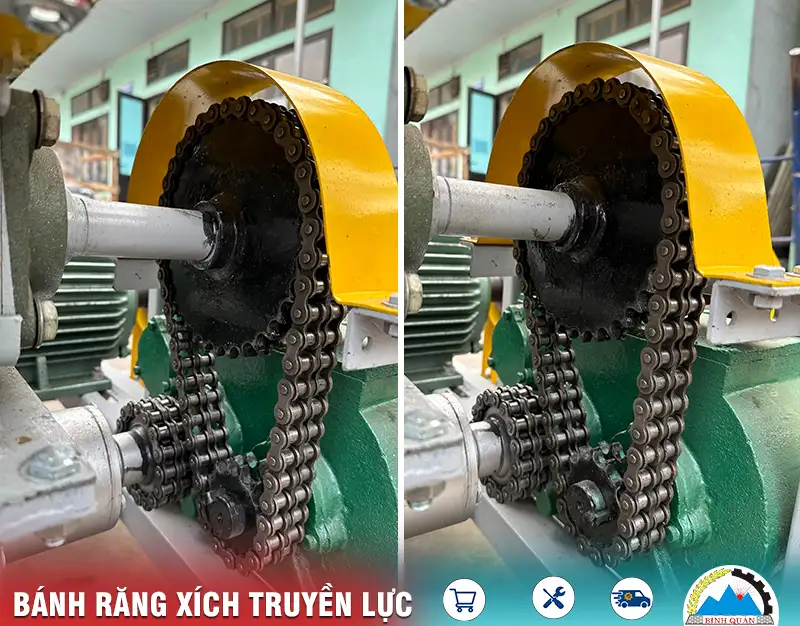 Bánh răng xích truyền lực chắc chắn kết hợp hộp số điều chỉnh tốc độ, giảm tốc độ quay từ motor. Nhờ vậy, máy có thể vận hành khỏe xuyên suốt quá trình đùn. Đồng thời, góp phần kéo dài tuổi thọ động cơ và các bộ phận đi kèm