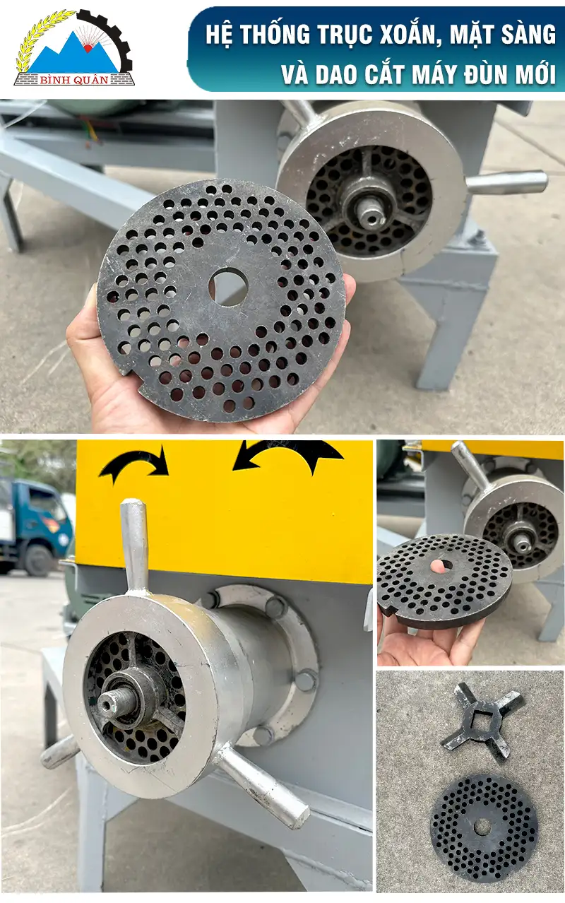 Đầu đùn khỏe kết hợp với 3 mặt sàng tùy nhu cầu người dùng lắp đặt cho ra thành phẩm (ví dụ: sàng 6ly; 10ly và 12 ly)