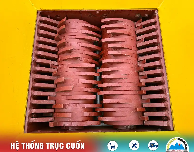 Khi máy hoạt động hai trục cuốn xoay tròn ngược chiều nhau, tạo ra chuyển động giống như "hút" nguyên liệu từ từ xuống buồng nghiền phía dưới.