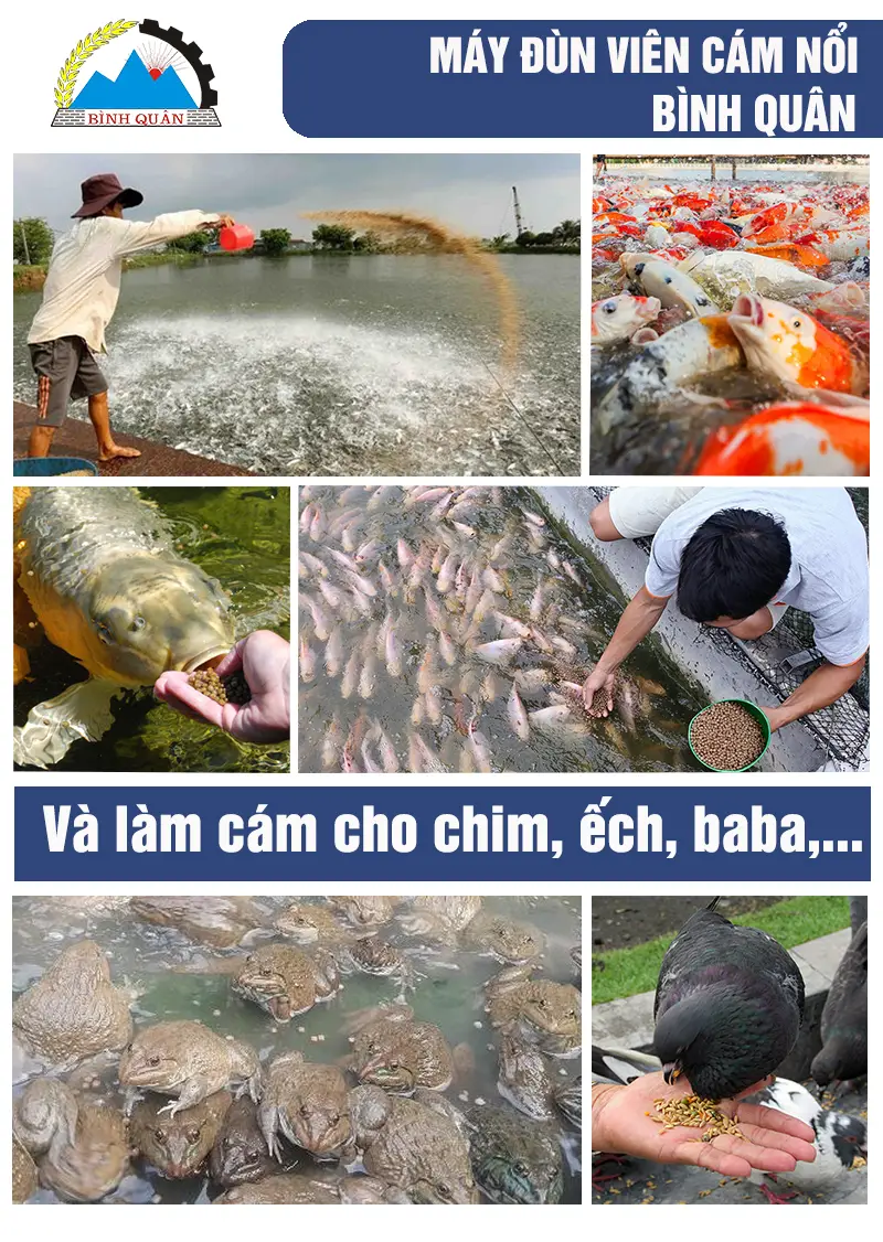 Thay vì phải phụ thuộc mua cám công nghiệp với giá cao. Thì giờ đây, bà con có thể tự sản xuất thức ăn cho cá với máy ép cám viên nổi Bình Quân.