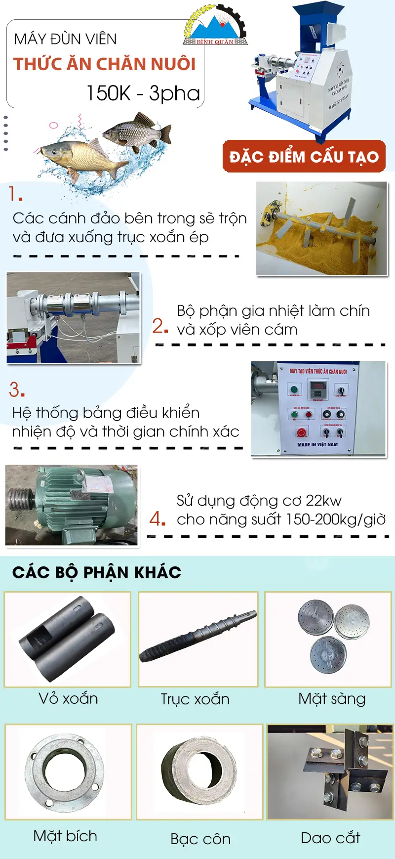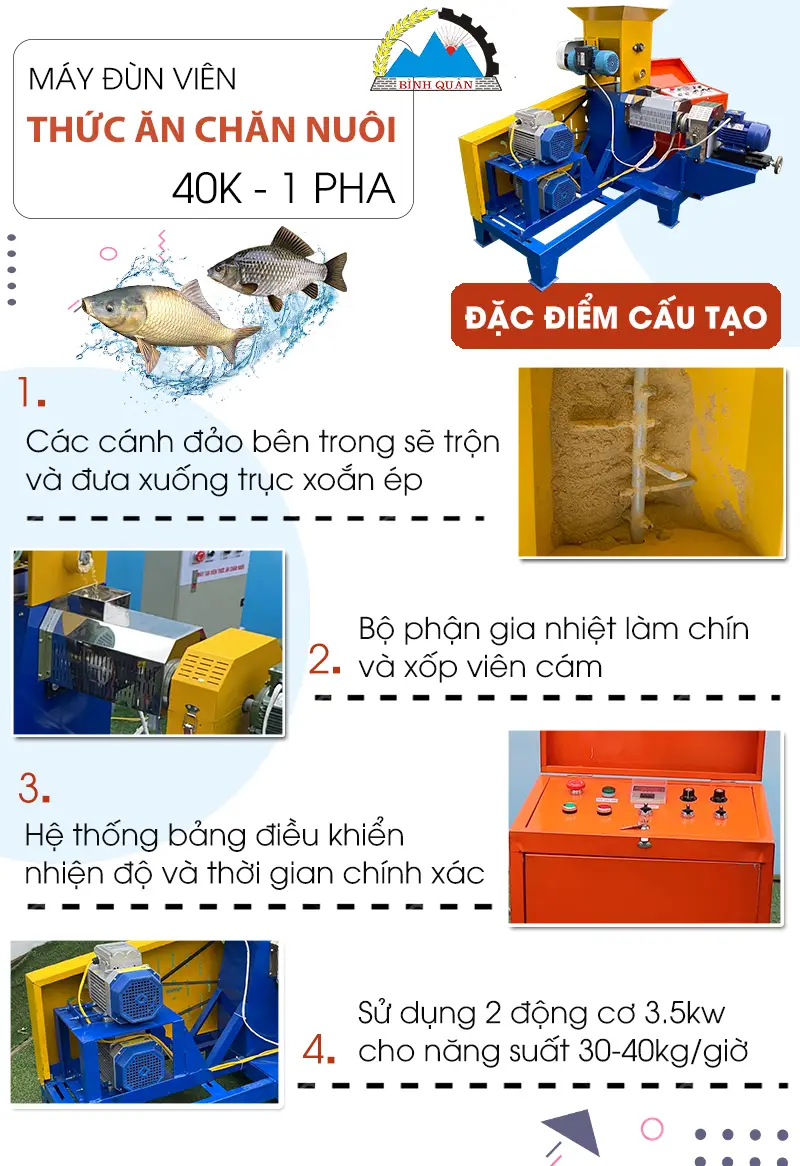 Là dòng máy mới được ra mắt của công ty Bình Quân. Máy được trang bị 2 động cơ công suất 3.5kw lõi đồng 100%, lực kéo khoẻ mạnh kết nối với nguồn điện ổn định 220V sẽ tạo ra viên cám chín – xốp – nổi.
