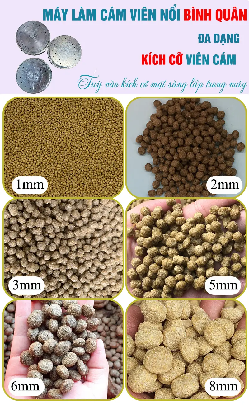 Máy có nhiều kích thước mặt sàng khác nhau từ 1ly; 1,5ly; 2ly; 3ly;…cho đến kích thước mắt sàng lớn như 6l6; 7ly; 8ly. Có thể cho đa dạng vật nuôi như gà con, chim cảnh, cá, ếch, baba,...