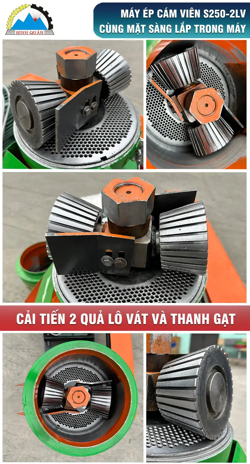 Máy ép cám 2 quả lô ép được thiết kế vát ôm sát mặt sàng, kết hợp với 2 cánh gạt điều chỉnh tạo nên 2 tính năng trong 1 máy "vừa trộn đều, vừa ép" nguyên liệu