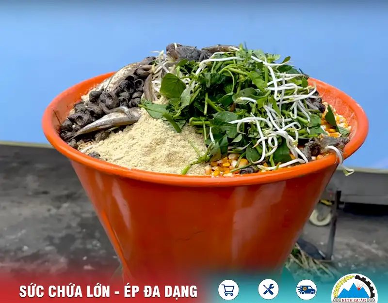 Toa nạp được thiết kế dạng phễu tròn, rộng có sức chứa hàng cân hỗn hợp cám trong quá trình ép