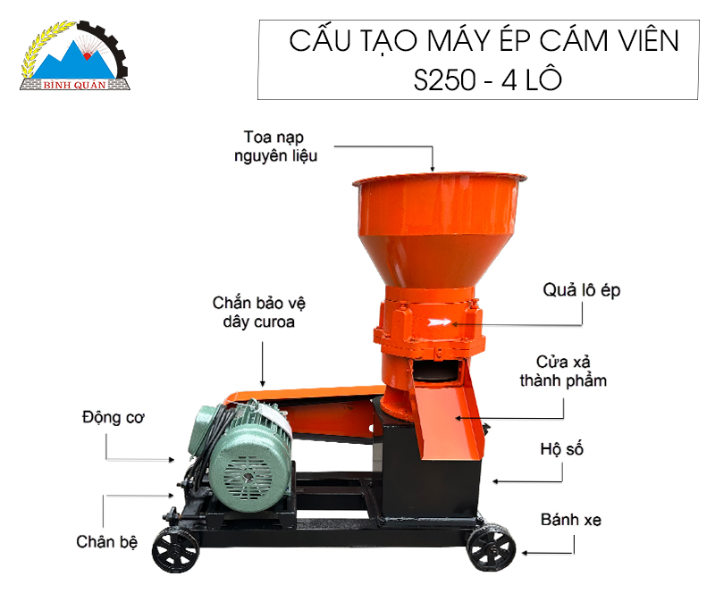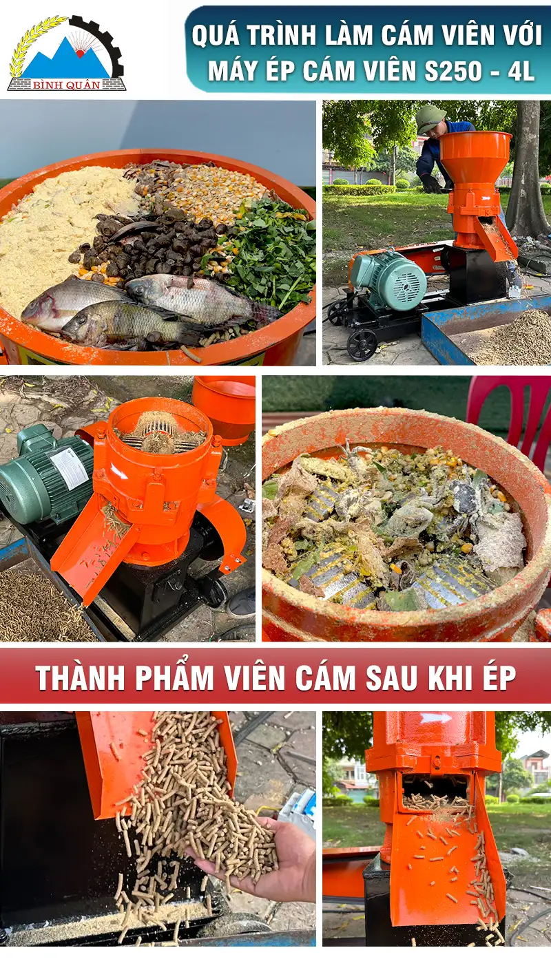 Thay vì mua cám ngoài với giá cao thì giờ đây, bà con có thể tự làm cám viên sạch ngay tại nhà tiết kiệm chi phí với máy ép cám viên S250-4L do công ty Bình Quân sản xuất