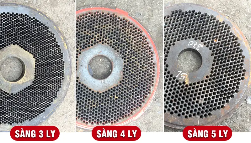 Mặt sàng dày 2 mặt, có thể đảo chiều sử dụng linh hoạt. Hơn nữa, bà con có thể lựa chọn kích thước lỗ sàng (3ly;4ly;5ly..) để tạo ra viên cám với kích thước phù hợp theo nhu cầu chăn nuôi