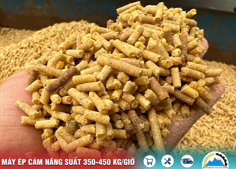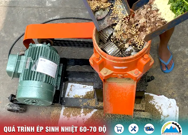Các bộ phận làm việc tạo ma sát sinh nhiệt khoảng 60-70 độ, viên cám ép ra có độ ấm nóng có thể cho vật nuôi dùng luôn