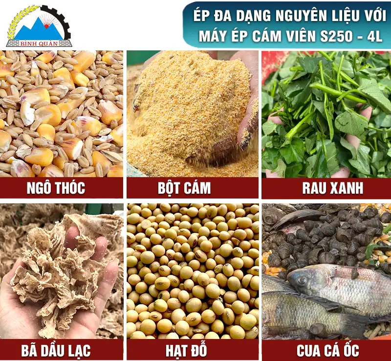 Máy ép cám viên S250-4L có thể nghiền đa dạng các loại nguyên liệu từ bột cám, ngô hạt đến các loại phụ phẩm như rau xanh, cua, cá, ốc, bã dầu lạc..
