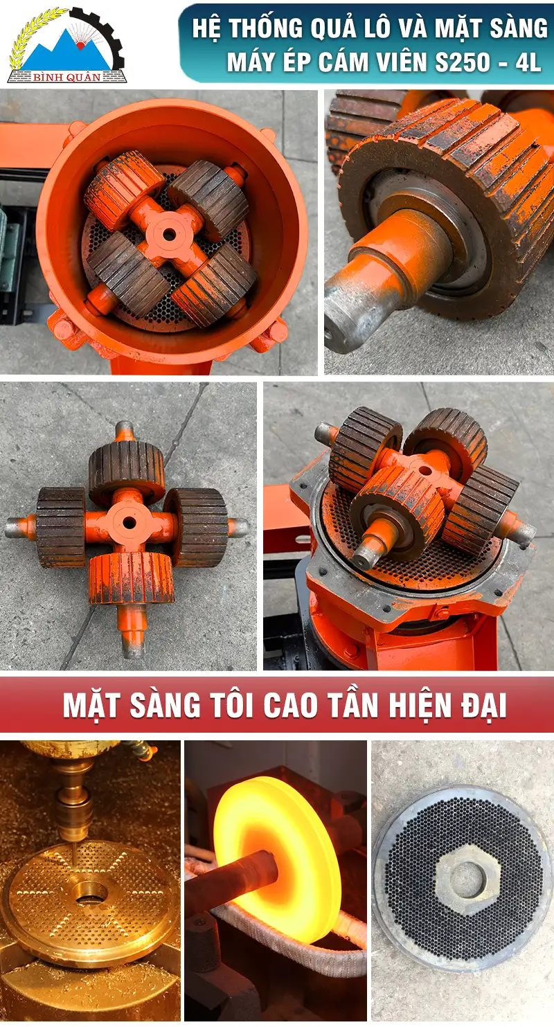 Máy ép thế hệ mới 4 quả lô, mỗi quả lô được tôi cao tần tạo độ cứng vượt trội hơn so với thép thông thường