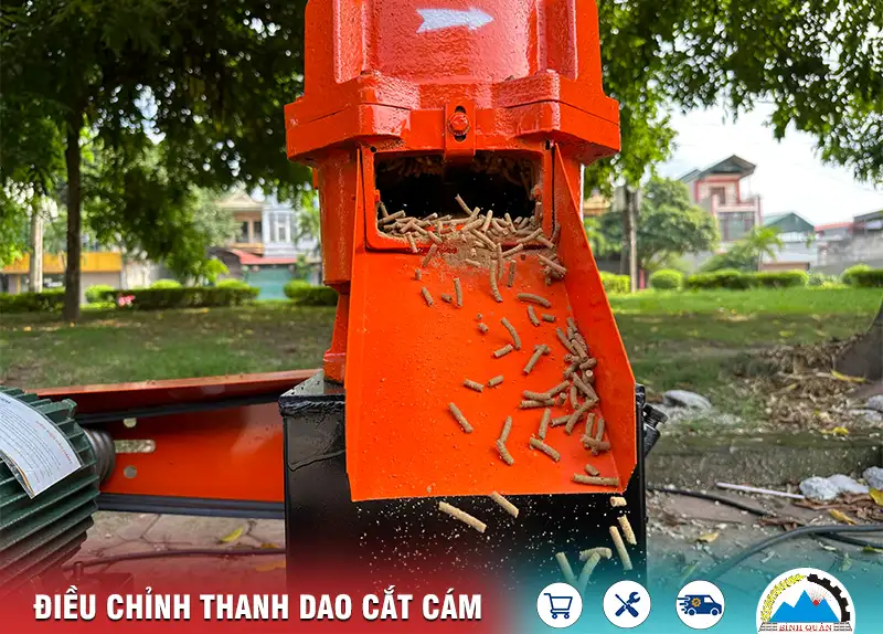 Phía trước cửa xả có thanh dao cắt giúp người dùng có thể tự điều chỉnh độ dài - ngắn của viên cám, bằng cách: