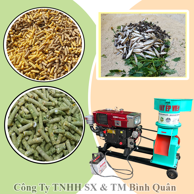 - Tính năng: Máy có chức năng nghiền và ép nhiều loại nguyên liệu thô như ngô hạt, ốc, cua, cá, rau, cỏ thành cám viên trong khoảng thời gian nhanh chóng